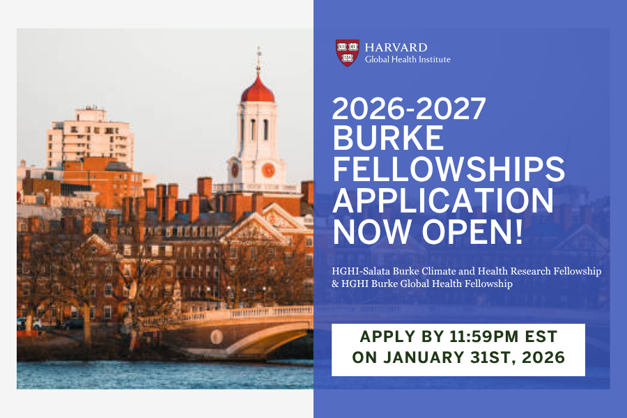 The Harvard Global Health Institute (HGHI) is now accepting applications for the HGHI Burke Fellowships, including the HGHI-Salata Burke Climate and Health Research Fellowship and the HGHI Burke Global Health Fellowship! Apply by 11:59PM EST on Saturday, January 31st, 2026.